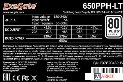 Markit » Блоки питания » Блок питания ExeGate 650PPH-LT 80 Plus EX282046RUS-S