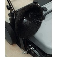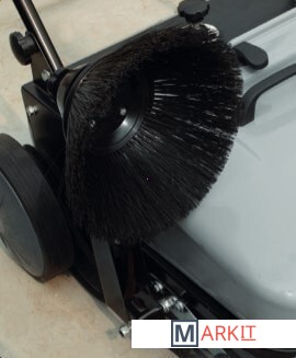 Подметальная машина имеет мощную стальную раму, регулируемое прижатие щетки, корпус выполнен из ударопрочного пластика, рукоятка регулируется по высоте, переднее колесо поворачивается на 360 градусов.