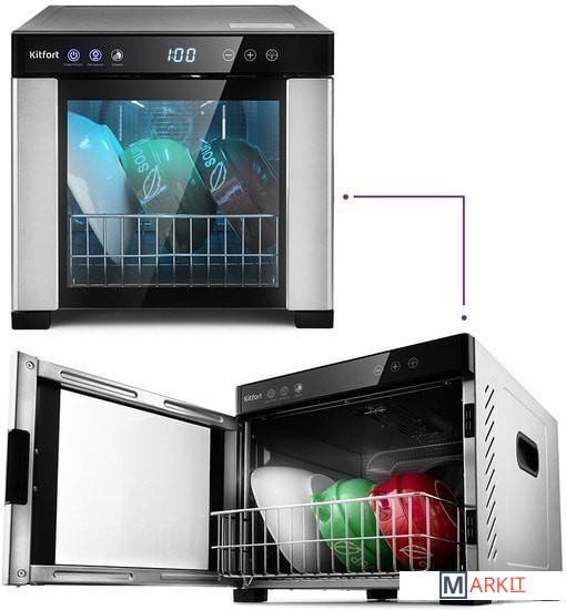Помимо сушки в КТ-1916 можно сушить и одновременно дезинфицировать посуду ультрафиолетовым излучением с помощью УФ-лампы. Прибор обеспечит стерильность и сушку вашей посуды. В комплекте предусмотрена специальная корзина для посуды.