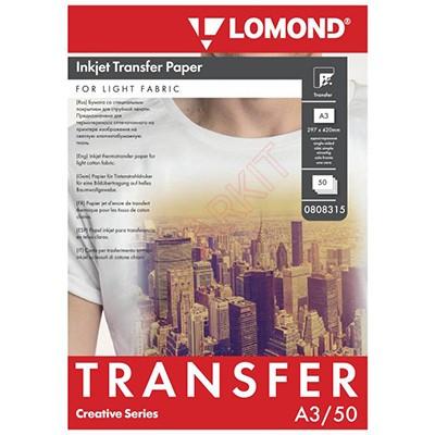 Термотрансферная бумага LOMOND серия TRANSFER PAPER, A3, 140 г/м2, ДЛЯ СВЕТЛЫХ ТКАНЕЙ (BRIGHT CLOTH), 50 листов, односторонняя, для струйной печати (0808315) Код: 3390