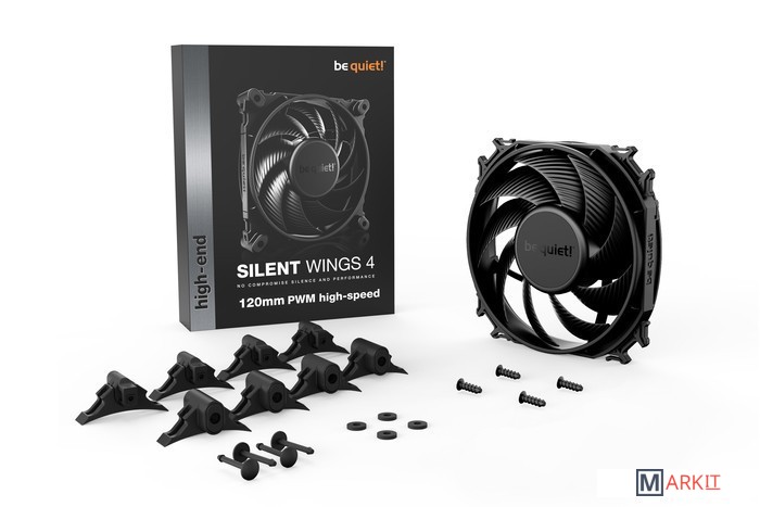 Silent Wings 4 120mm PWM сочетает все особенности практически бесшумного вентилятора с чрезвычайно высокой производительностью охлаждения для самых требовательных приложений.Оптимизированные лопасти вентилятора для максимальной эффективности на радиаторах СВОУменьшенный зазор между лопастями и рамкой вентилятора c воронкообразным выходным отверстием для очень высокого давления воздуха Практически бесшумная работа при номинальной скорости6-полюсный мотор вентилятора и гидродинамический подшипник для снижения вибраций и очень плавной работыАнтивибрационное крепление с нажимными штифтами и возможность установки при помощи винтовДлительный срок службы до 300 000 часовЭлегантный внешний вид с качественной наклейкой вентилятора в полностью черном корпусеSilent Wings 4 120mm PWM — лучший выбор для любого сценария использования вентилятора. Будь то установка в корпус, на радиатор кулера или системы водяного охлаждения — такие его особенности, как оптимизированные для бесшумной работы лопасти и воронкообразная рамка вентилятора, делают Silent Wings 4 120mm PWM именно тем решением, которое не приемлет компромиссов между практически бесшумной работой и высокой производительностью охлаждения.Silent Wings 4 120mm PWM обеспечивает очень высокое давление воздуха и, следовательно, значительно повышает производительность системы охлаждения. Высокий уровень воздушного давления достигается за счет уменьшенного зазора между лопастями и рамкой вентилятора, что позволяет Silent Wings 4 120mm PWM гарантировать надежное охлаждение ПК даже в самых требовательных программах.Silent Wings 4 120mm PWM укомплектован двумя вариантами креплений. Предварительно установленное антивибрационные крепления сводят к минимуму генерирующие шум вибрации. Для установки на радиаторы кулеров и СВО лучше подходят пластиковые крепления. Оба решения обеспечивают практически бесшумную работу вентилятора на номинальной скорости.6-полюсный мотор вентилятора с 3 фазами обеспечивает очень низкое энергопотребление, меньшие вибрации и, следовательно, бесшумную работу с макс. 18,9 дБ(A). Использование этой передовой технологии обеспечивает очень плавную работу и низкое энергопотребление вентилятора.Усовершенствованный гидродинамический подшипник (FDB) обеспечивает крайне длительный срок эксплуатации вентилятора до 300 000 часов. Кроме того, он значительно снижает вибрации и гарантирует практически бесшумную работу Silent Wings 4 120mm PWM .Установленный на радиаторе кулера или внутри корпуса, Silent Wings 4 120mm PWM всегда производит отличное впечатление. Высокая производительность и впечатляющий внешний вид Silent Wings 4 120mm PWM с полностью черным дизайном в сочетании со стильной центральной наклейкой вентилятора делает его изюминкой любой системы.